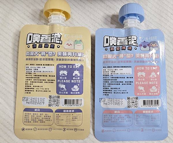 1.口味:這次先隨機選兩個口味試試,滿足雞鱷(毛髮保健)、超級鮪鴿(腸胃保健),不得不說,包裝是真的有夠可愛,原本擔心含鱷魚肉口味那包查理會不愛,但其實查理蠻賞臉