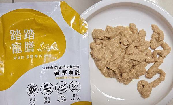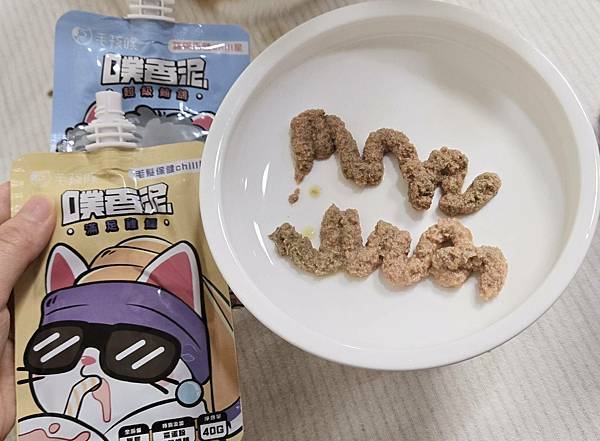 老實說,剛開封時,查理沒有馬上吃,是這次五款中會猶豫吃的餐包,我是先擠在餐盤上+零食肉泥,讓查理熟悉味道後,才開始單獨幾餐包吃。