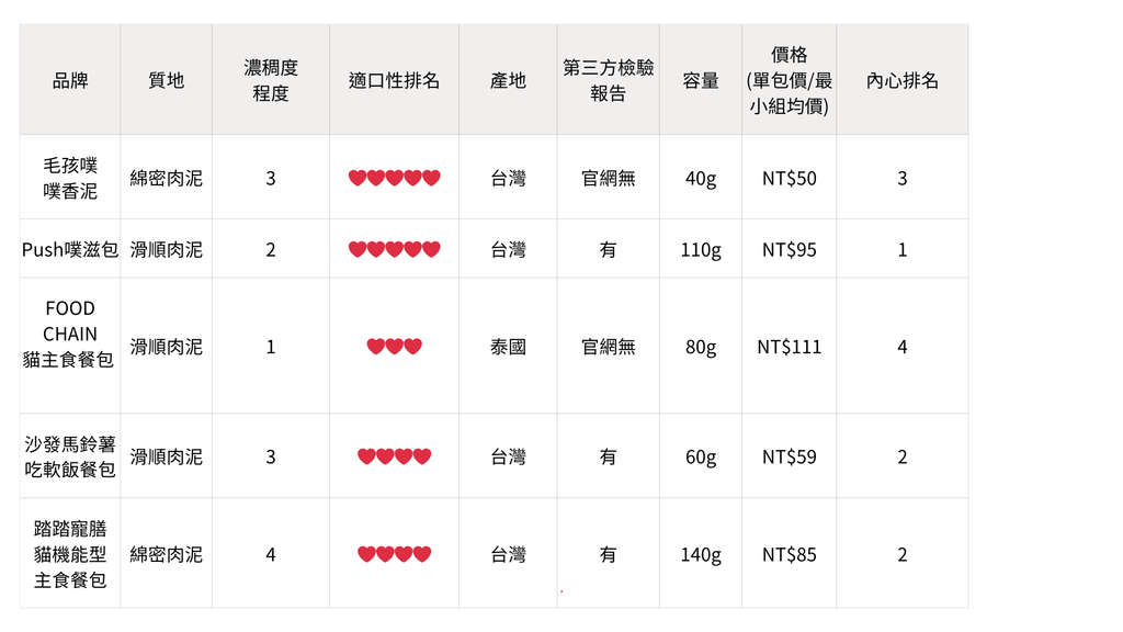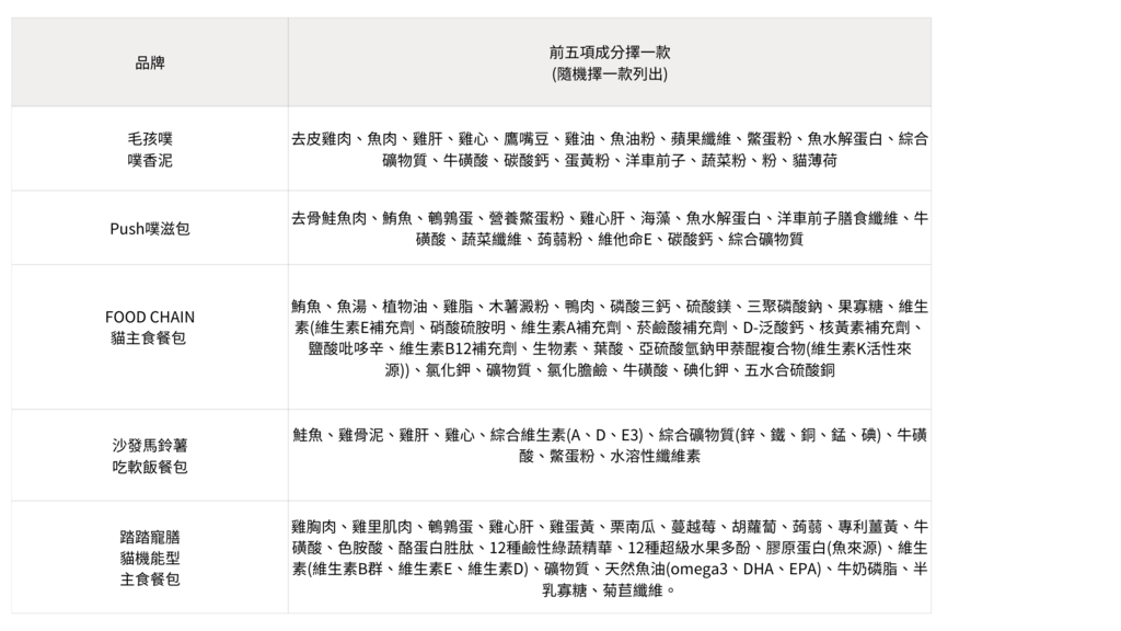 我將從成分、質地、適口性、第三方檢驗報告、克數和價格等方面進行綜合比較,為各位貓家長提供參考。(未來也會不定期新增更多品牌的評測唷)